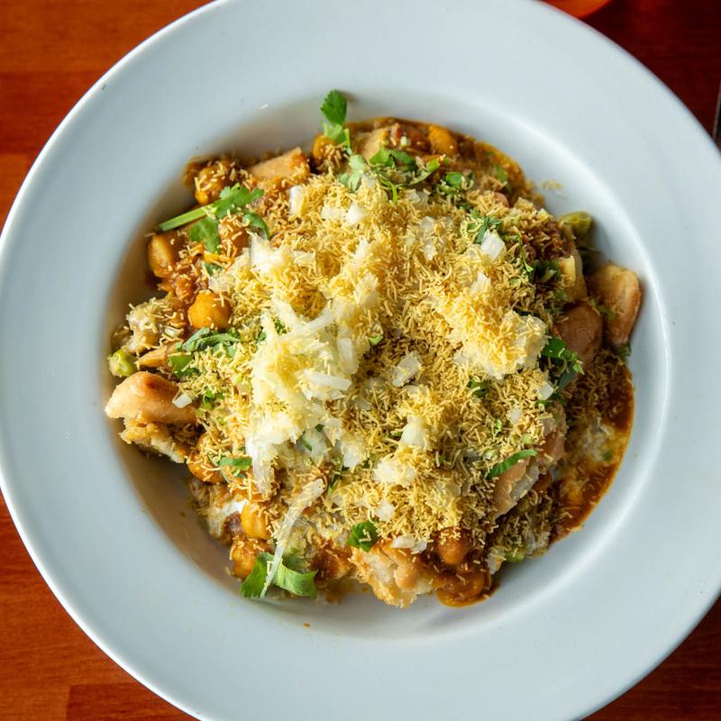 Crushed samosa topped with spiced chickpeas, yogurt, tangy chutneys, and fresh herbs. A vibrant mix of flavors and textures