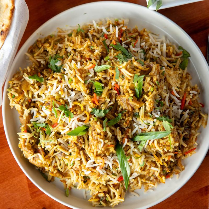 Half Tray (Serves 10) ($85.00) | Full Tray (Serves 25) ($185.00) • Basmati rice and marinated lamb cooked in chef’s special biryani masala