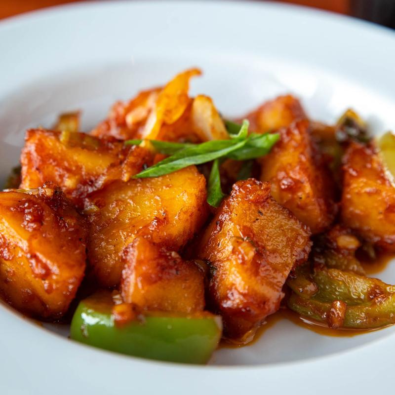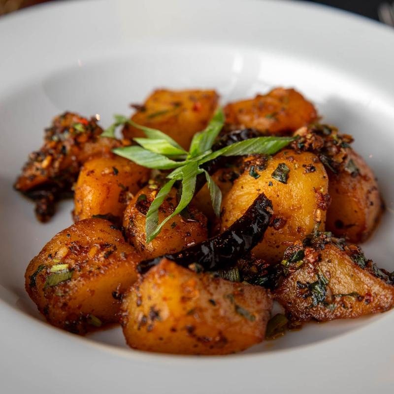 Potatoes sauteed with onion, bell pepper, red chili, and Sichuan pepper