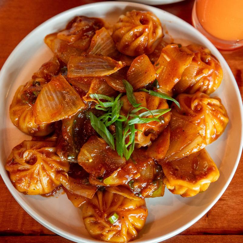 Steamed dumplings filled with spiced chicken or vegetables, stir-fried in a sweet, tangy, and fiery chili sauce with onions and bell peppers for an irresistible kick