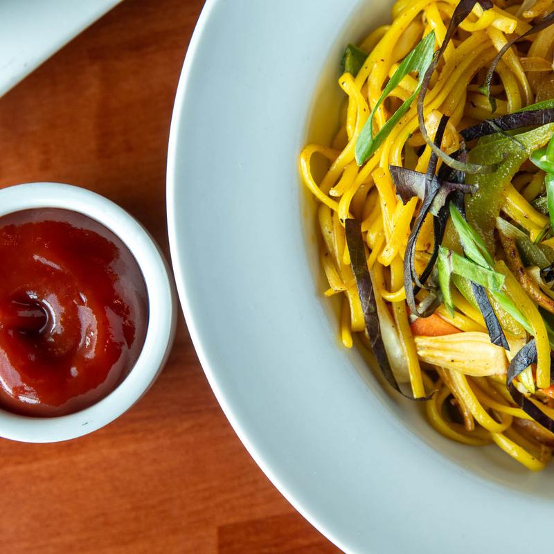 Stir-fried noodle with vegetables with Indian and Himalayan spices