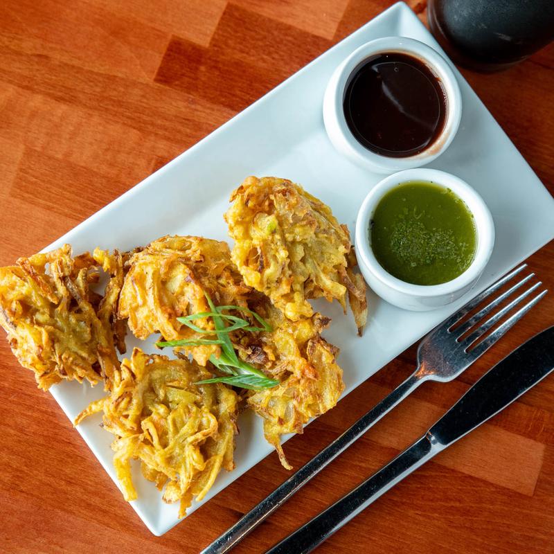 Half Tray (Serves 10) ($35.00) | Full Tray (Serves 25) ($99.00) • Mildly spiced vegetable fritters dipped in batter & deep-fried