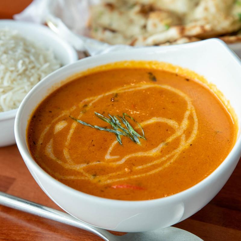 Half Tray (Serves 10) ($80.00) | Full Tray (Serves 25) ($200.00) • Clay oven-roasted shredded chicken cooked in creamy tomato sauce